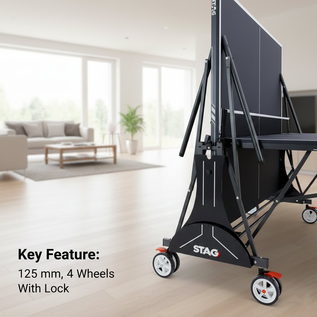 - 125 mm Transport Wheels with Locks – Smooth mobility with reliable locking wheels keeps the table safely in place during matches.